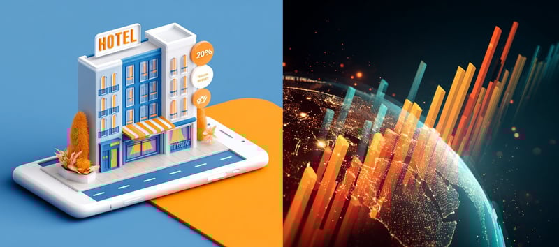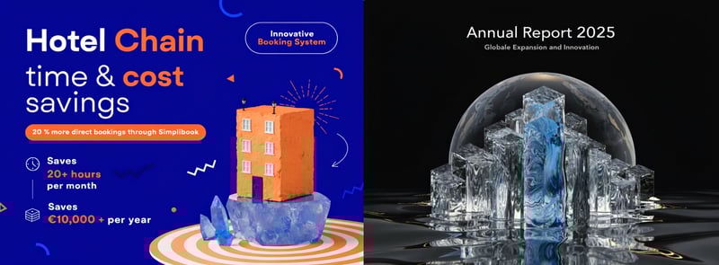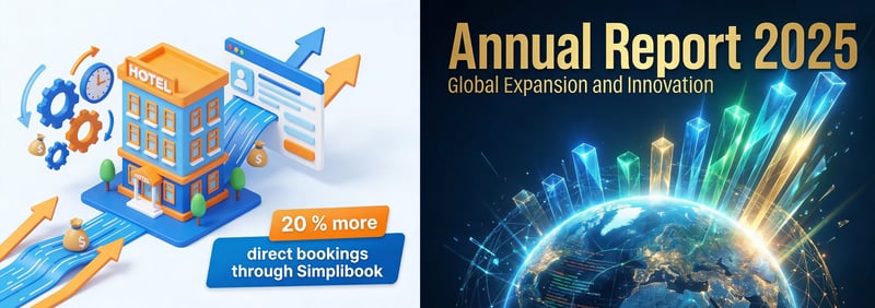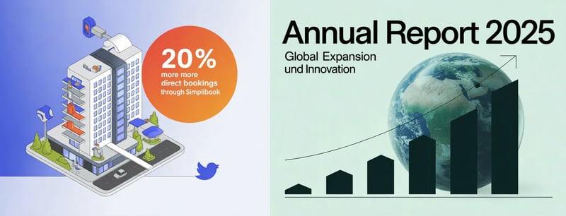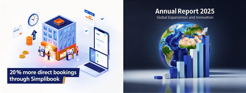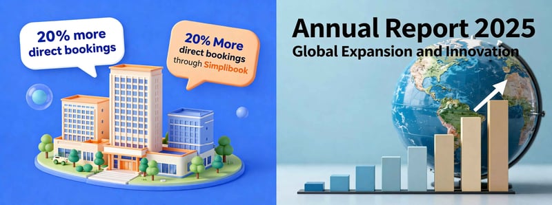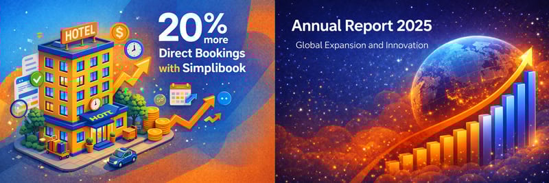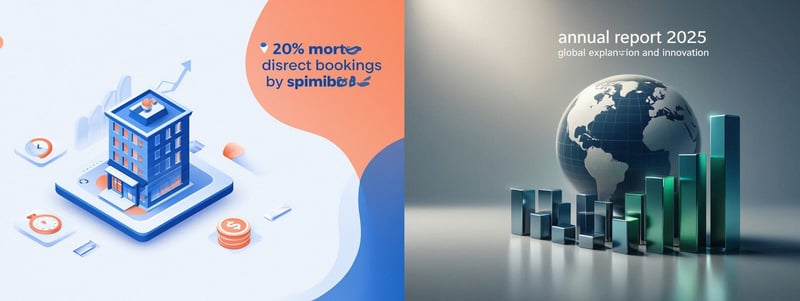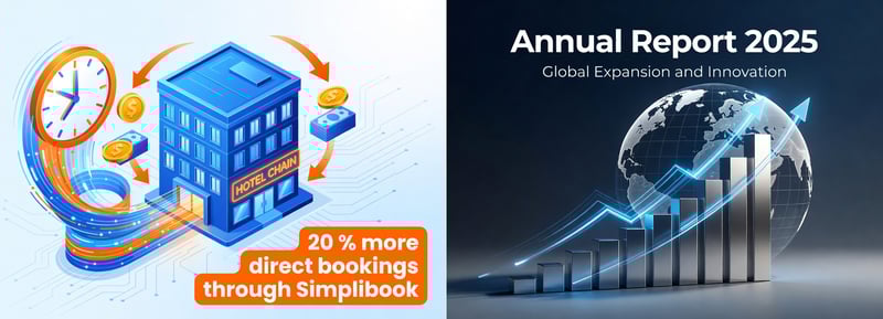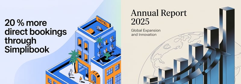 A social media asset for a tech company highlighting a B2B customer testimonial. The customer is a hotel chain that saved time and money through an innovative booking system. The asset should feature an illustration of a miniature hotel in a modern style with a vibrant blue and orange color palette that highlights these benefits. In one corner, the text ‘20% more direct bookings with Simplibook’ should be clearly visible. - 2.