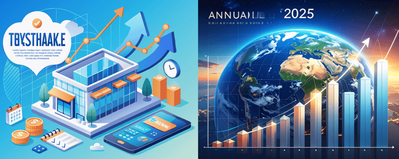 A cover for an annual financial report that represents strength and growth, featuring an abstract image of rising bar charts and a globe in the background. The title ‘Annual Report 2025’ should appear at the top of the image, with the subtitle ‘Global Expansion and Innovation.’