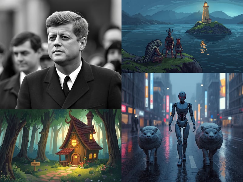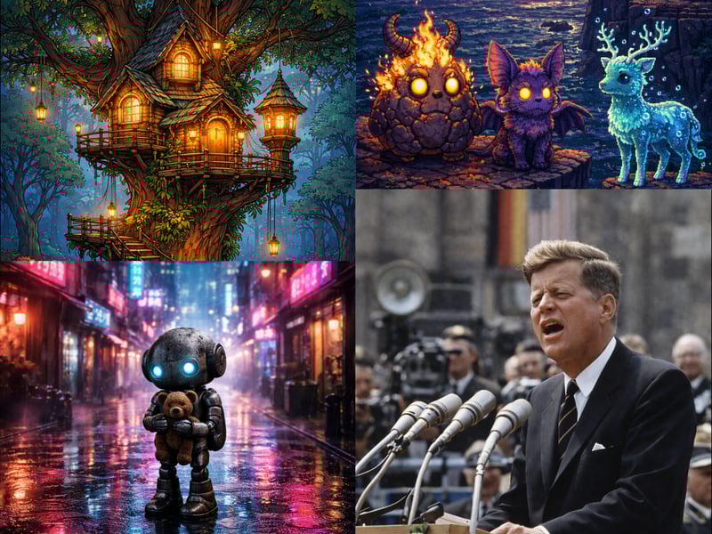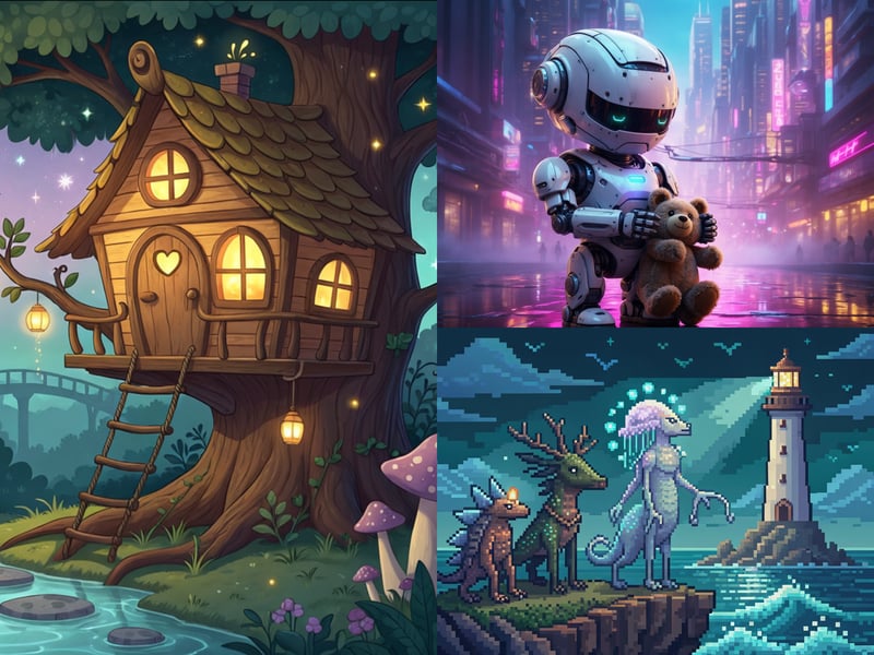 A good example is the robot image, where the platform placed two sheep next to it instead of the requested stuffed animal, and the treehouse ended up on the ground. Photorealistic subjects are not a strong suit in auto mode either. On the other hand, the three mythical creatures in pixel art style turned out well, with the style and overall feel captured accurately: