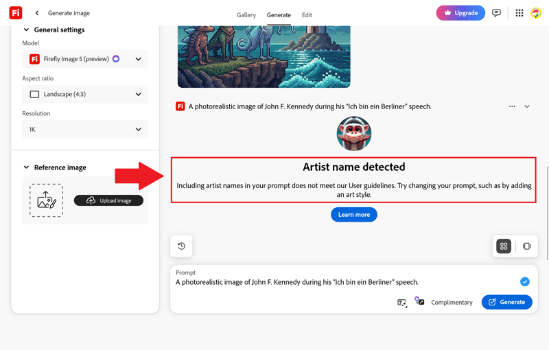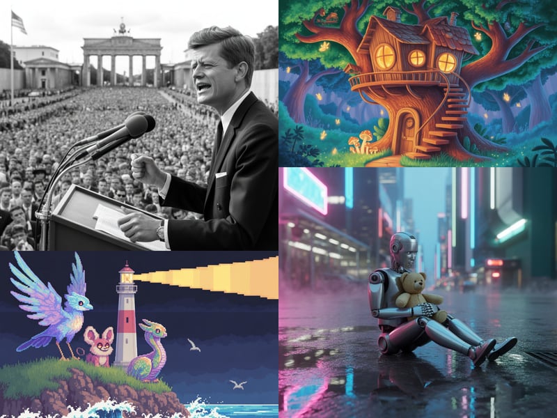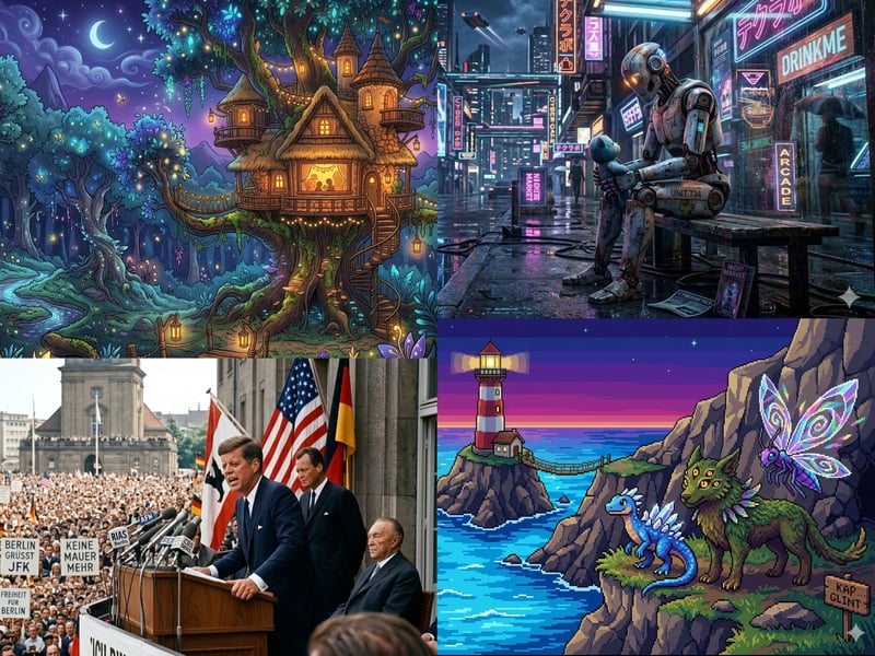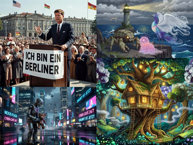 The John F. Kennedy in Berlin image turned out better than with any other model we tested. Google’s AI even included German Chancellor Adenauer and Berlin’s governing mayor Brandt, who were both present during the speech. Flags and text are accurate too: