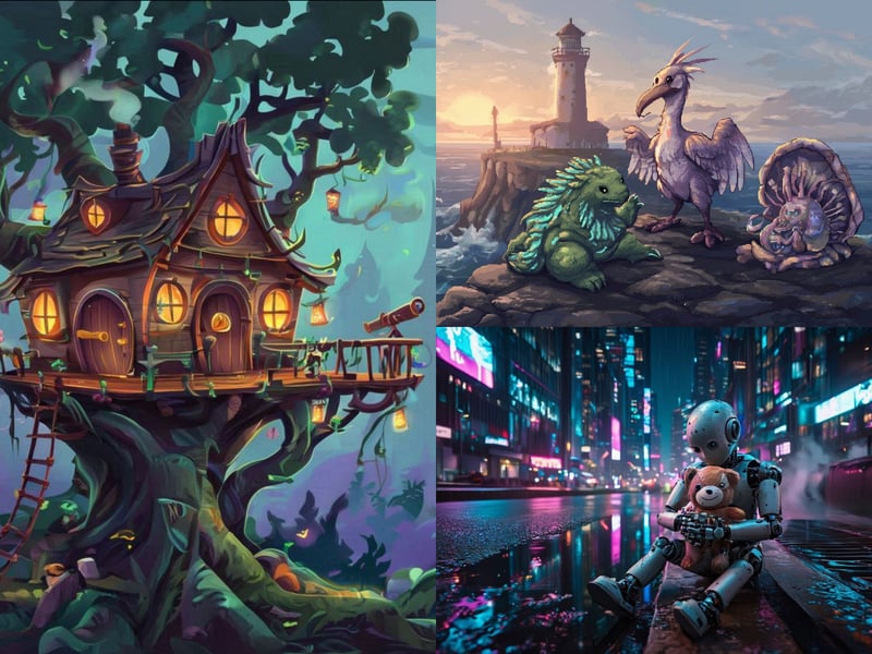 Our sample prompts featuring a cartoon treehouse, a robot, and three mythical creatures were handled very well by Nano Banana 2. The robot is the only one in our comparison that meaningfully interacts with its stuffed animal.
