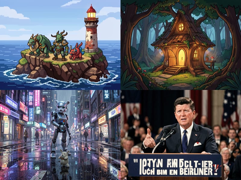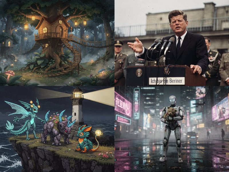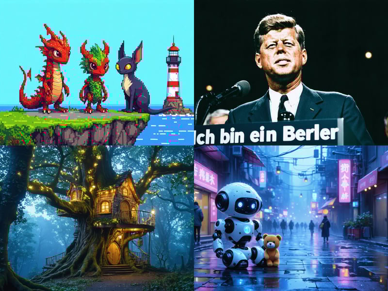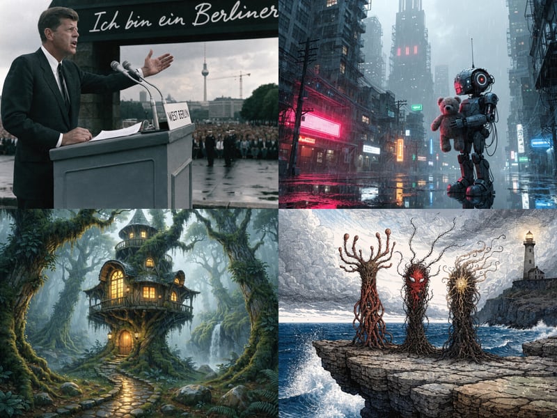 A photorealistic depiction of Kennedy’s famous Berlin speech (first image)? Not even close. And the three fantasy creatures (third image) are barely recognizable: