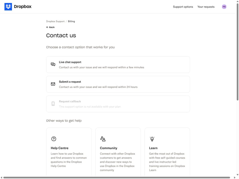 Unfortunately, Dropbox doesn't have an automated refund process. To get your money back, you’ll need to contact Dropbox support directly.