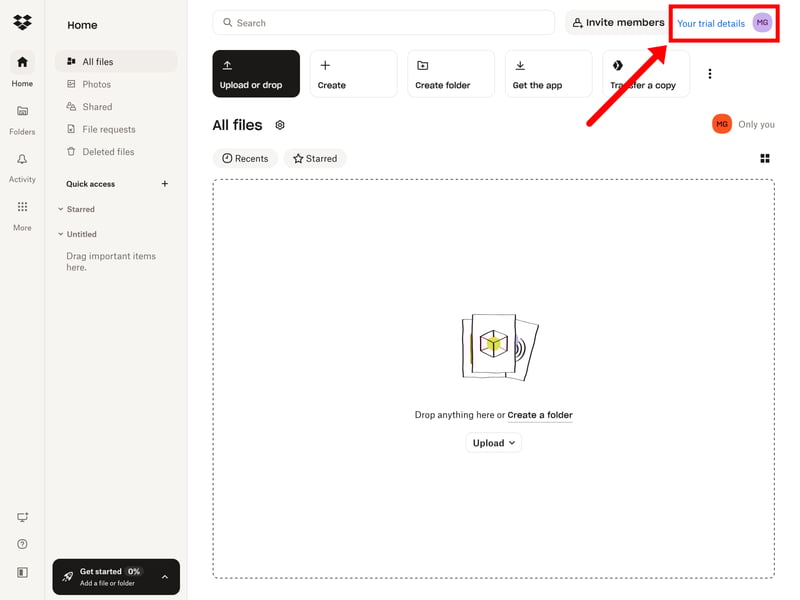 Click your profile icon in the top-right corner of the Dropbox web dashboard. If you’re still on a trial, you might see how many days you have left right next to your initials.