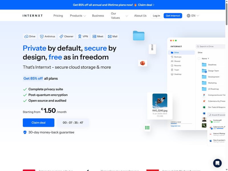 Feedback for Internxt is mixed. Many users like its clean interface, competitive pricing, and strong privacy focus. Others report software bugs, high resource usage, limited features, and slow upload speeds.