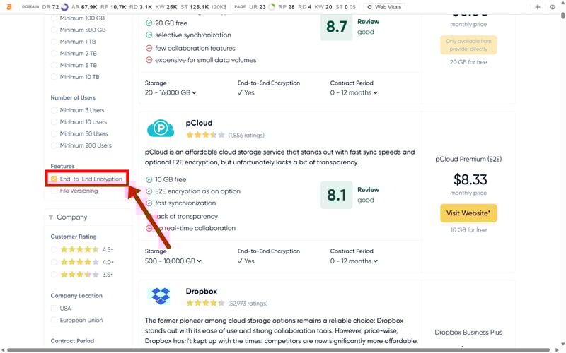 In our cloud storage comparison, you can search specifically for providers with E2E encryption.