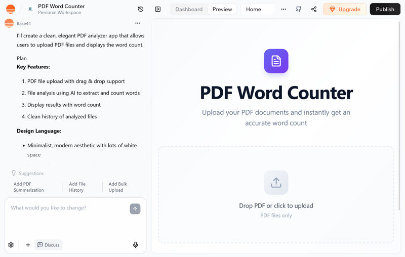 A simple example is the instruction "Create a web application that uploads PDF files, analyzes them, and outputs the word count." The AI's result is then a React component with file upload, PDF parser, UI feedback, and results display.