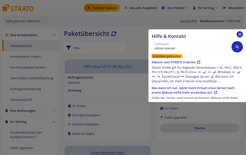 Un des points forts de STRATO est que le centre d’aide est directement intégré au tableau de bord. Un simple clic sur l’icône « ? » ouvre une fenêtre de recherche, où vous pouvez saisir des termes comme « Reboot vServer » ou « Accès Plesk ». Le système affiche alors les articles FAQ correspondants et fournit un lien direct vers le portail d’aide complet.