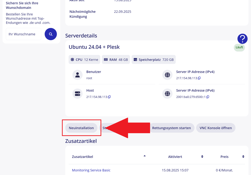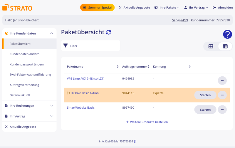 Selon l’e-mail de confirmation, le serveur a été activé 26 minutes plus tard. Cependant, il n’apparaissait toujours pas dans le tableau de bord STRATO. Ce n’est qu’après plusieurs heures que le produit s’est affiché dans l’espace client, sans aucune notification envoyée.