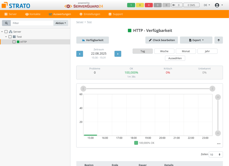 Le monitoring serveur est assuré via un service externe, serverguard24.de, qui vérifie la disponibilité de vos services. Le forfait de base gratuit inclut un contrôle simple (comme HTTP ou Ping) toutes les 30 minutes.