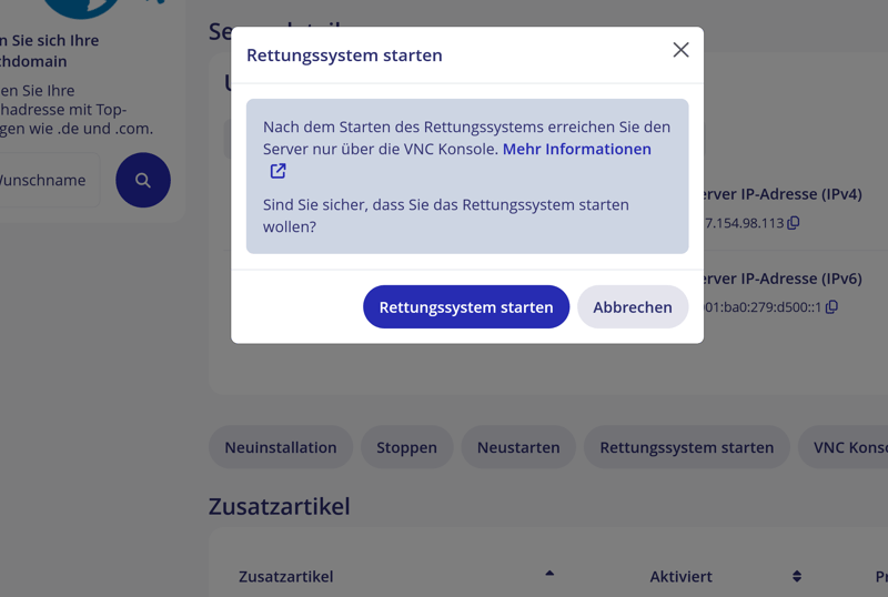 Cependant, une fois le système de secours activé, la connexion SSH n’est plus possible. Vous pouvez alors accéder au serveur uniquement via la console VNC, ce qui permet néanmoins de gérer et de dépanner efficacement votre VPS.