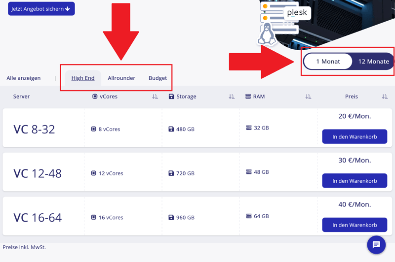 Pour les VPS Linux, STRATO propose trois catégories de serveurs, classées selon leur niveau de performance : High End, Allrounder et Budget.