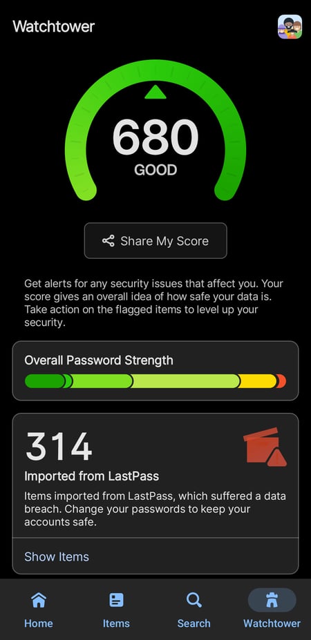 Check your security score in the 1Password Watchtower.