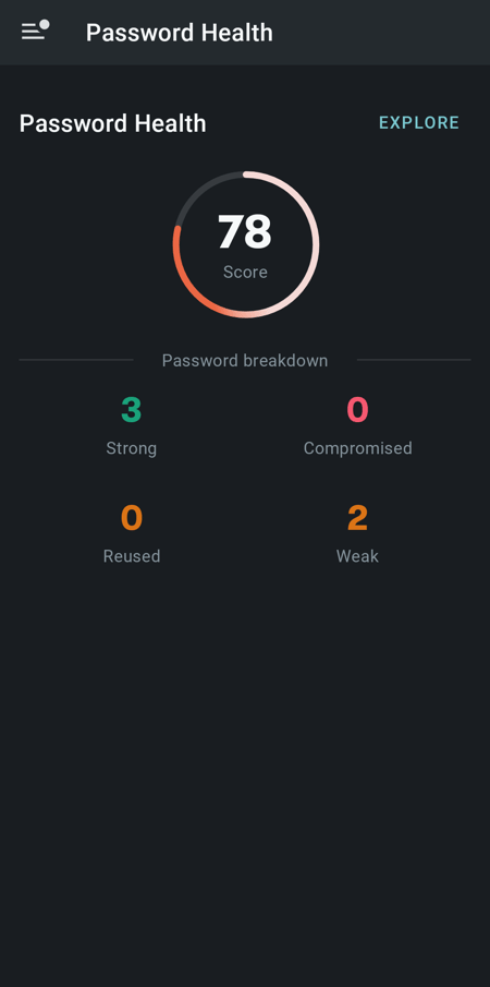 All key features from Dashlane's desktop and web apps are available on Android devices: The password health score helps you track your account security, while the Password Changer automatically updates passwords for selected accounts without visiting their websites.