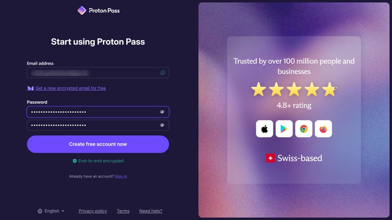 If you’re new to Proton (or prefer to keep things separate), you can quickly set up a new account. Thanks to the free plan, you don’t need to enter any payment details. Once you've signed up, you can log in and get started right away.