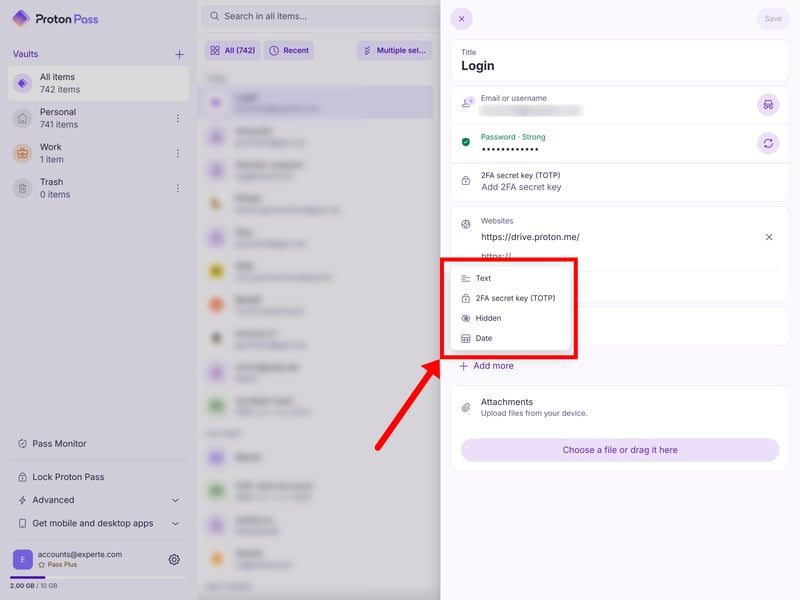 Proton Pass covers all the main item categories you’d expect. You can store login details, payment information, identities, and secure notes across all plans, including the free tier. You can also attach files to each entry, so everything related to an account stays in one place.