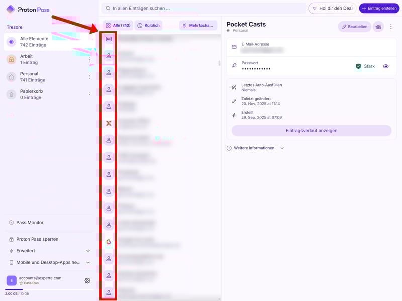 On the left, you’ll find your vaults. A vault is simply a collection of entries. You can use them to separate work and personal logins, or create a shared vault for family members, for example. The free plan includes two vaults, while paid plans support up to 50.