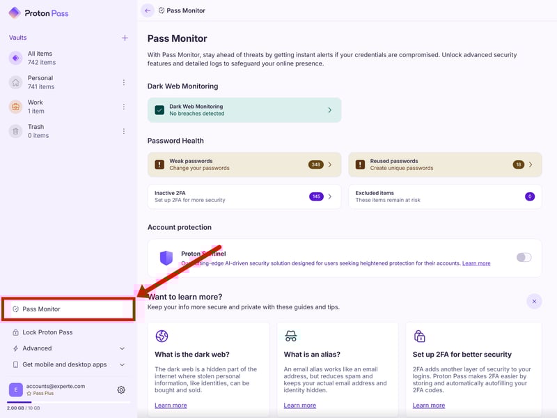 A password manager isn’t just about storing and creating new credentials. It should also help you keep your existing accounts secure. Like most providers, Proton Pass includes a security dashboard for this, called “Pass Monitor”: