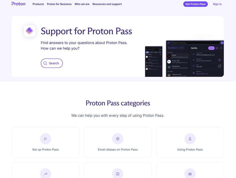 If you'd rather find answers on your own, you can browse Proton's help center. It has a dedicated section for Proton Pass, complete with a search function. The articles are pretty good, and most of them include step-by-step instructions and screenshots.