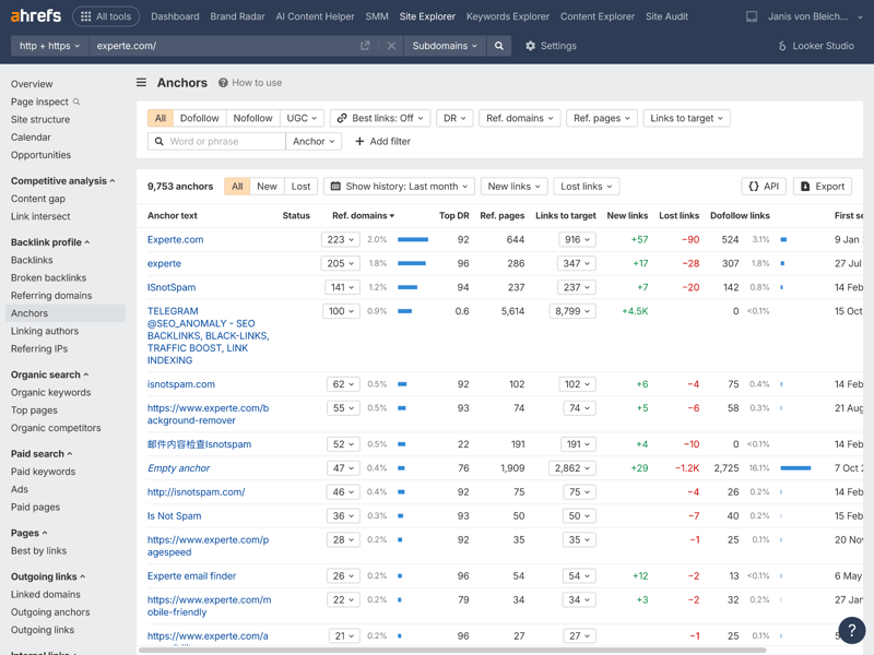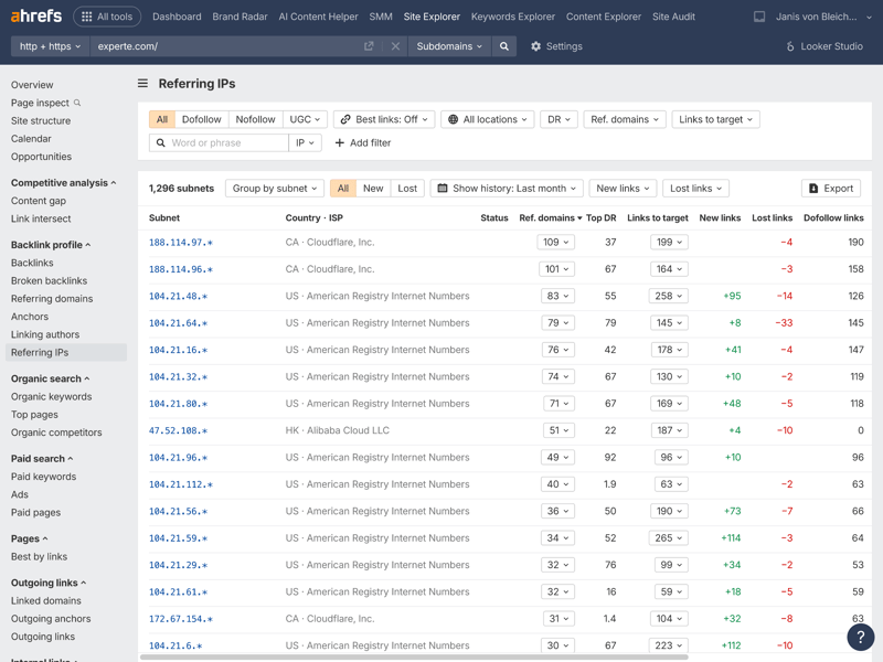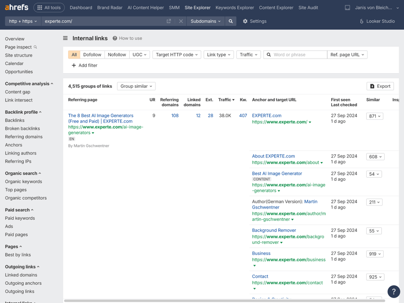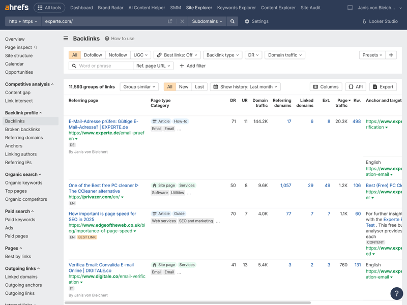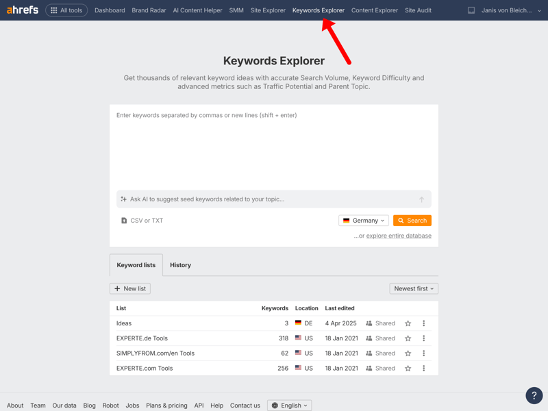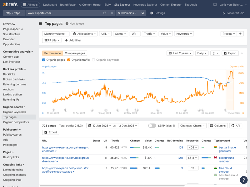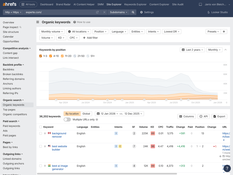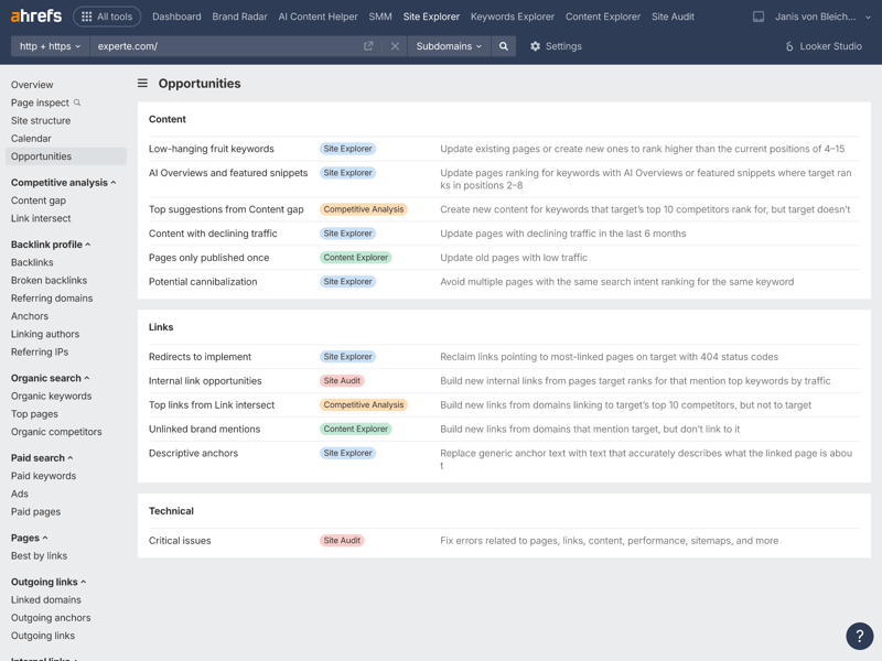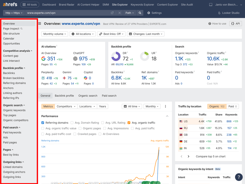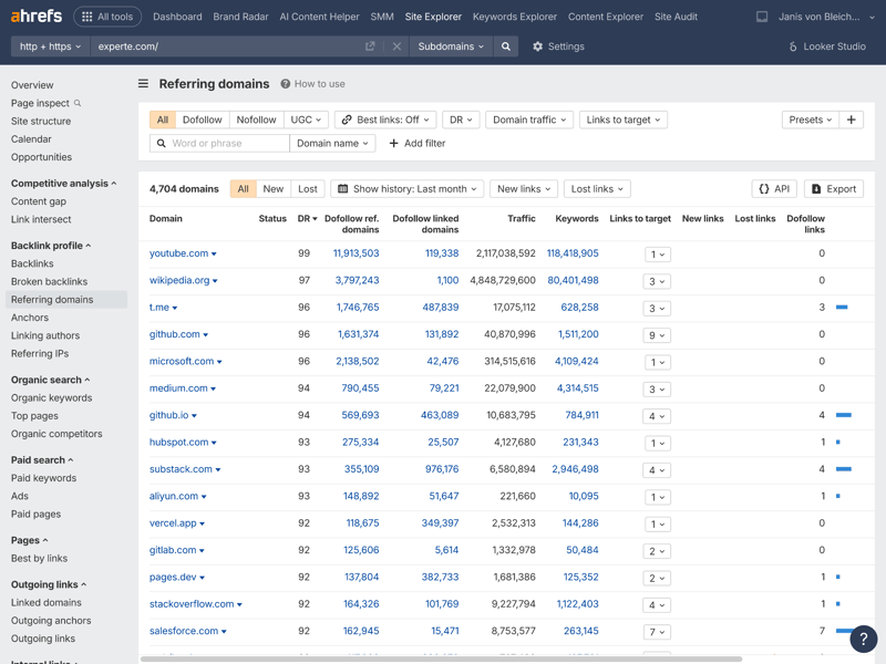 One of Ahrefs’ core modules is the Site Explorer. Right from the domain overview—shown here using experte.com as an example—the tool displays a wealth of relevant metrics in a clear layout.
