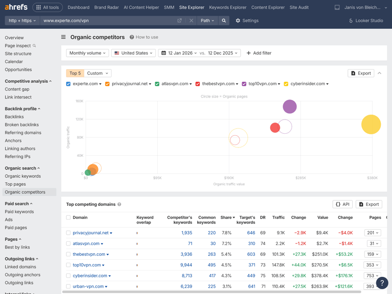 Ahrefs handles competitor analysis in two main areas, both within Site Explorer: the “Organic search” section and the dedicated “Competitive analysis” module. Together, these views offer powerful tools for systematically analyzing and benchmarking competitors.