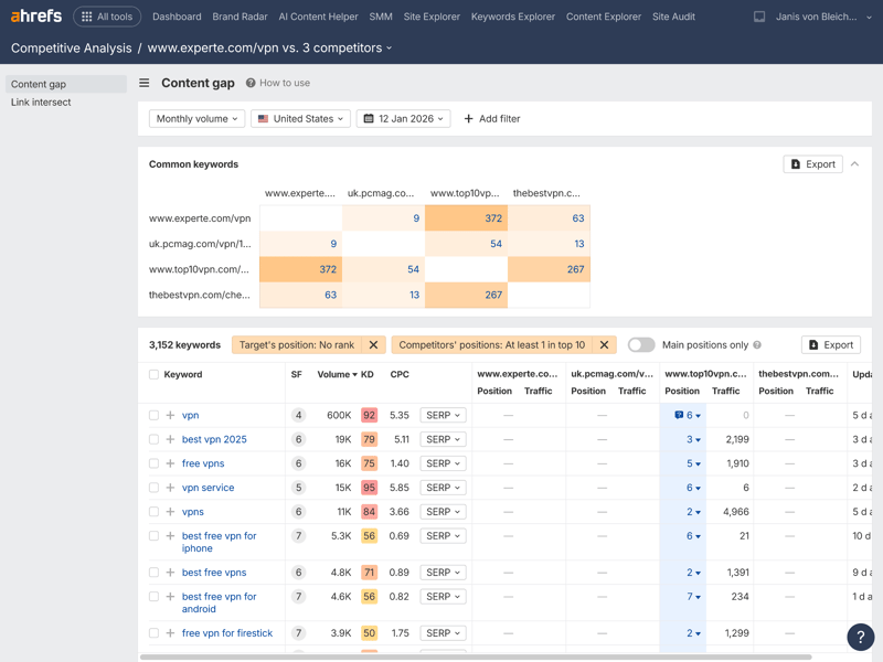 Within the competitive analysis module, Ahrefs offers a particularly useful tool called “Content Gap.” It reveals topic overlaps with up to ten competitors and goes beyond a simple comparison with your domain. It also compares your competitors against each other.