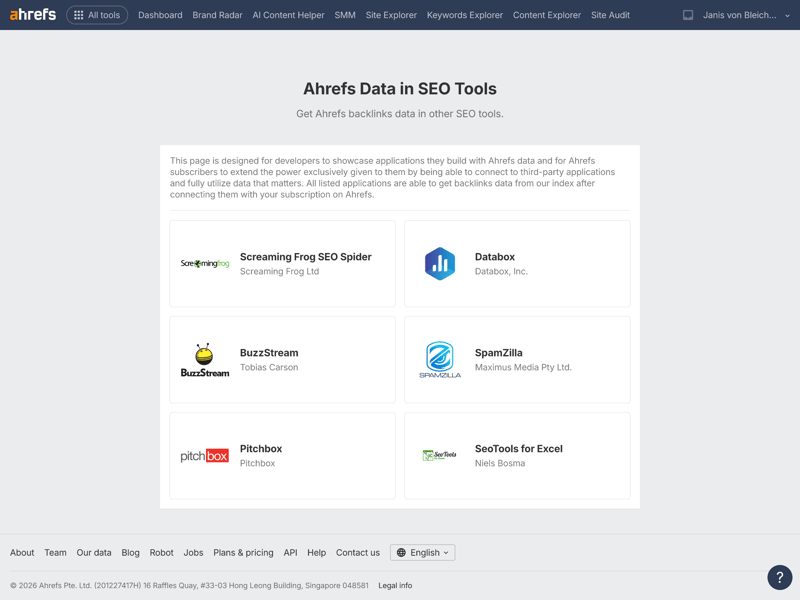 Ahrefs also integrates with tools like Screaming Frog, Databox, BuzzStream, and SpamZilla.