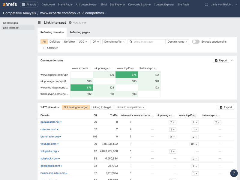 The backlink gap analysis works similarly. Instead of keywords, it focuses on referring domains. You can see which backlinks your competitors have that your site is missing.