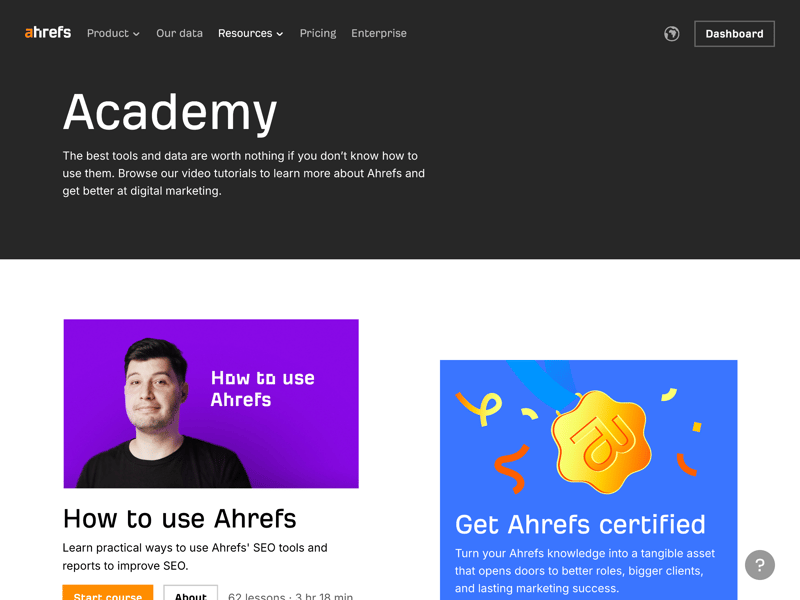 On top of that, Ahrefs Academy provides free, in-depth courses covering each module of the tool. These courses address both fundamentals and advanced use cases.