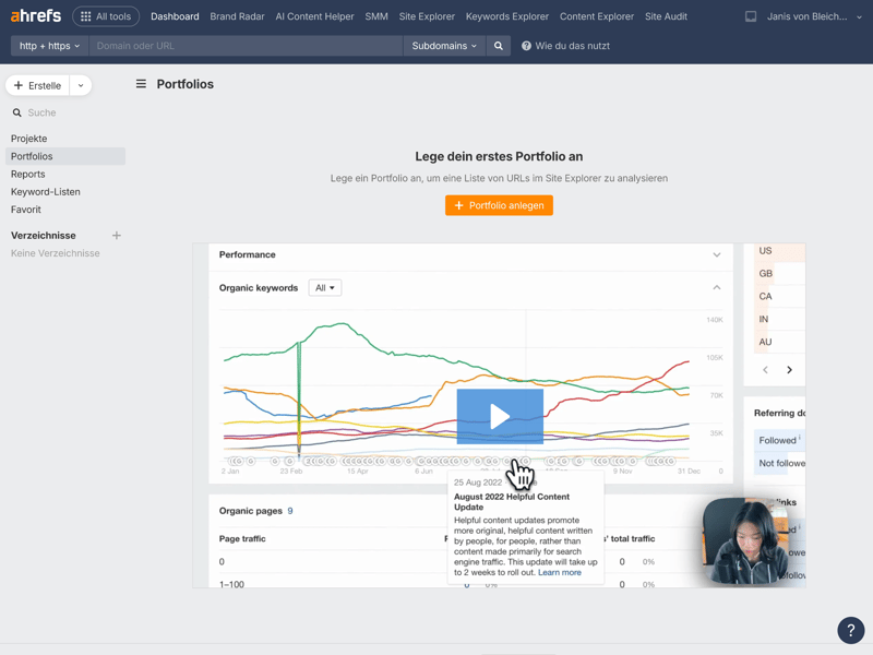 For views that need more explanation (like “Portfolios”), Ahrefs embeds helpful tutorial videos.