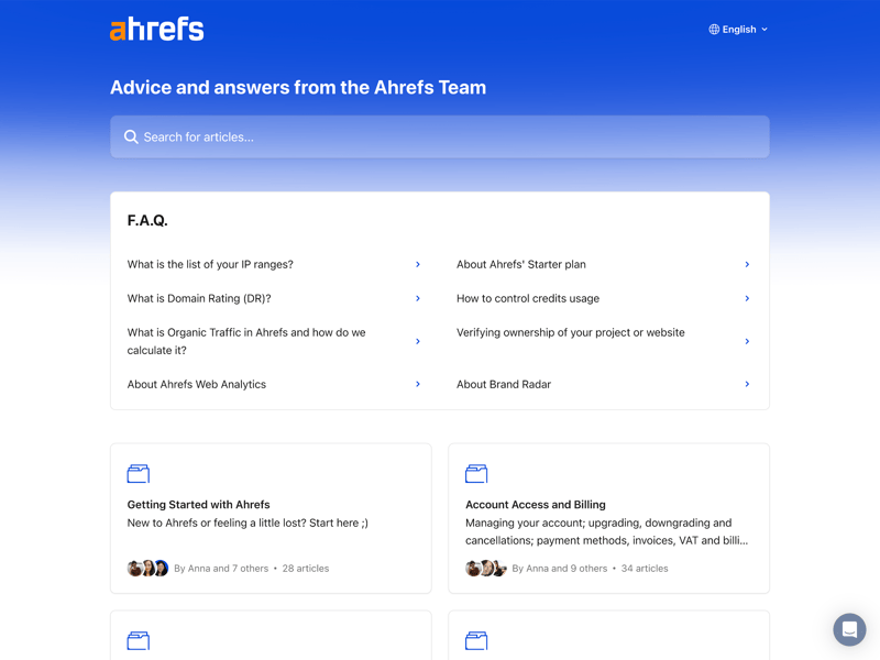 For questions about SEO topics or account management, Ahrefs provides a clear FAQ page. It’s also only available in English, even though you can select “German” in the language menu.