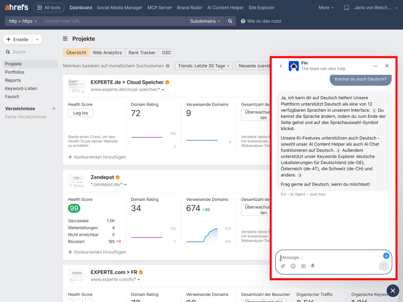 For individual questions, Ahrefs offers a live chat directly in the tool, plus the option to email their support team. During our test, Ahrefs was able to respond in German: