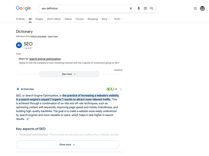 With the rise of AI-generated answers—like Google’s AI Overview—the rules of the game are changing even more. More and more searches end as zero-click searches: users get their answer directly on the results page without clicking through to a website. This reduces organic traffic—even with top rankings.