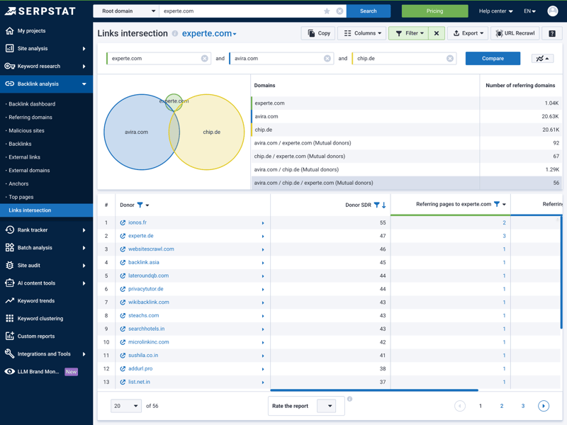 Backlink analysis works the same way through the “Link Intersection” feature. Compare up to three domains to find out which websites link to your competitors but not to you.
