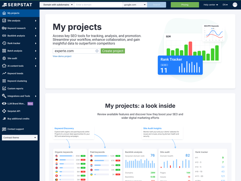 However, if you want to use more advanced features like long-term rank tracking or regular site audits, you’ll need to create a project first. Only then do all these features become fully available.