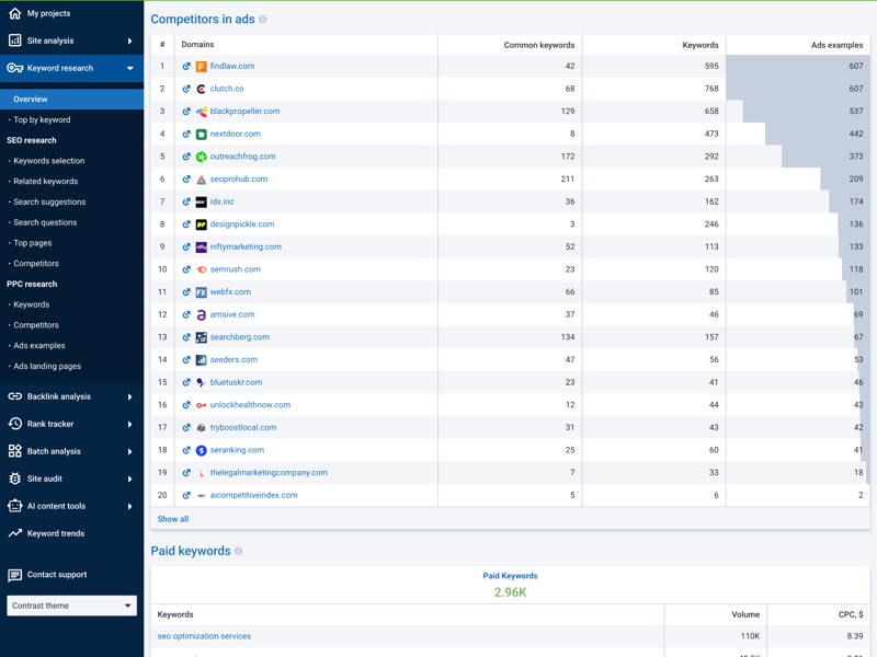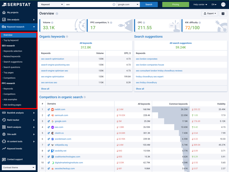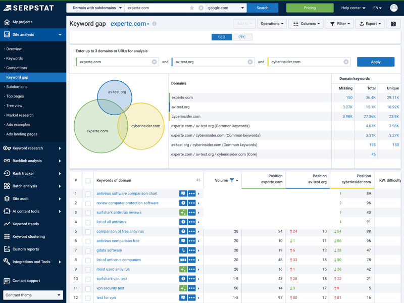 Serpstat also supports batch analysis for keywords and domains, which saves a lot of time on larger projects.