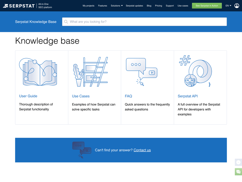 The Knowledge Base contains detailed guides for each of Serpstat’s features.