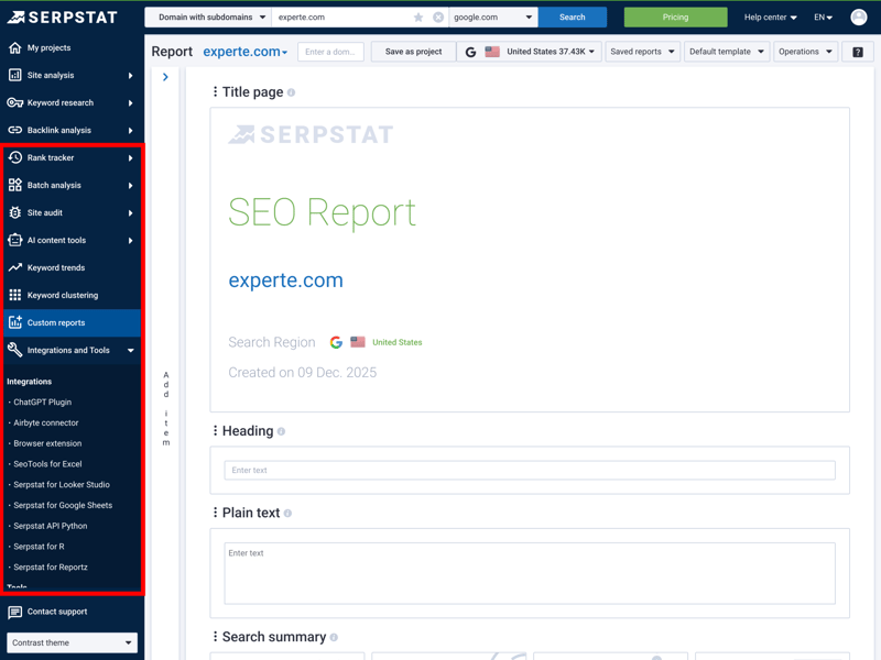 Serpstat excels significantly in its reporting capabilities. Customizable report templates are available for working with clients or internal teams, allowing you to assemble precisely the metrics crucial for each project. White-label reports, featuring custom branding, are exclusively included in higher-tier plans.