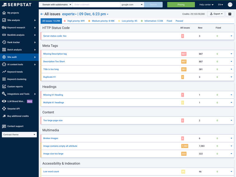The technical audit categorizes errors by urgency (high, medium, low). So you can prioritize the most critical issues and allocate resources wisely.