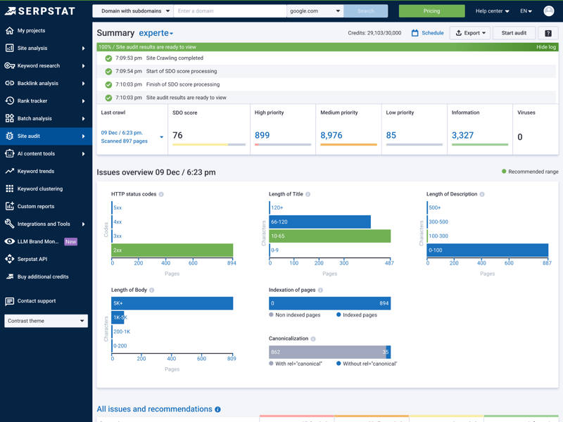 Site Audit | Serpstat crawls your site for technical errors. The report prioritizes issues by severity, allowing you to address critical ones first. |
