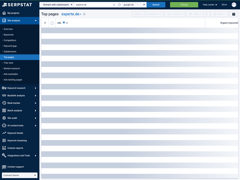 Serpstat’s focus is clearly on functionality. The tool is visually practical but doesn’t offer many explanatory elements or visual aids. Despite the large amount of data, navigation stays manageable, which benefits experienced users in particular. After a short learning period, SEOs with prior knowledge should find their way around quickly.