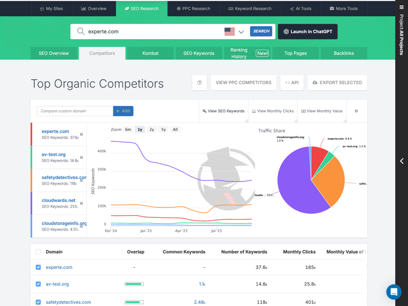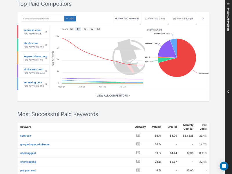 SpyFu certainly lives up to its name: competitor analysis is front and center; it’s the core of the tool. Unlike many other SEO solutions, competitor data is not merely a supplementary feature here; it serves as the foundation for nearly all other reports.