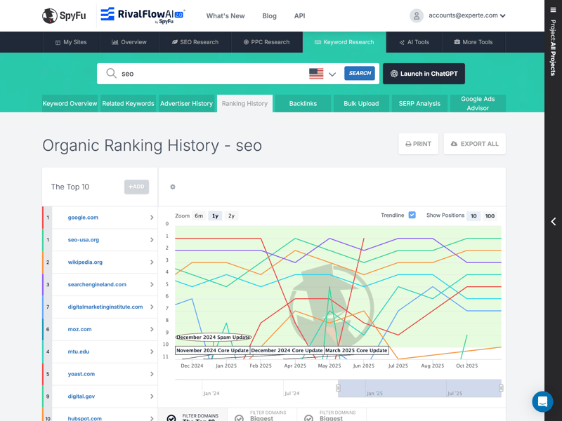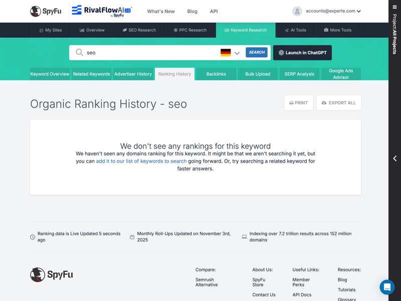 SpyFu impresses with its focus on essentials and the well-designed visual presentation of data trends. While the absence of a traditional dashboard might initially feel unfamiliar, it allows users to jump straight into analysis.