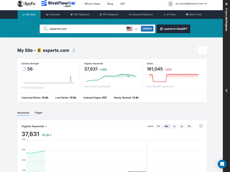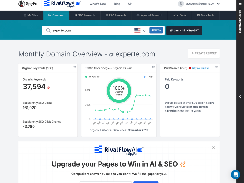 SpyFu is not an all-in-one SEO tool; rather, it is a highly specialized expert in competitor analysis. The tool excels in niches that others overlook: combining SEO and PPC data and generating genuine sales leads. It also provided the most accurate traffic estimates in our tests, all while remaining one of the most affordable options available.