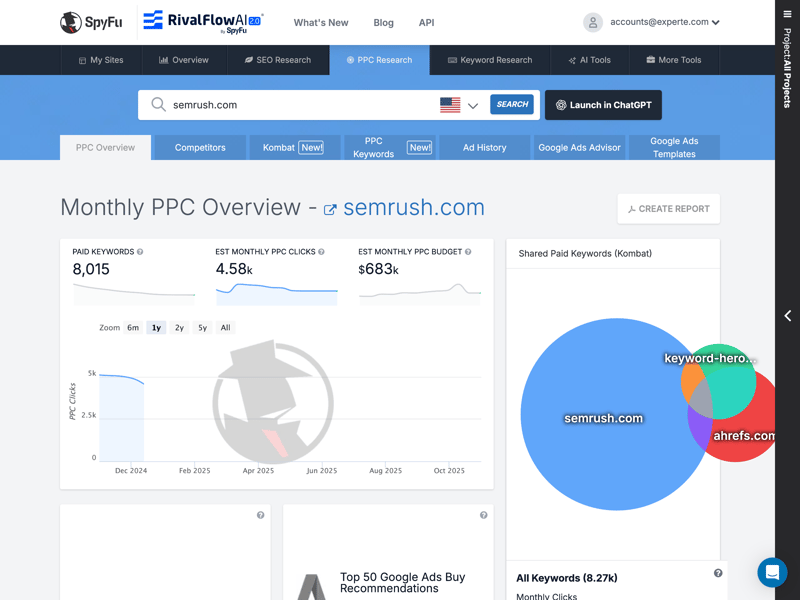 SpyFu goes deeper into competitor strategies than most SEO tools. It doesn’t just show where others rank—it also highlights their areas of underperformance.Unique PPC data