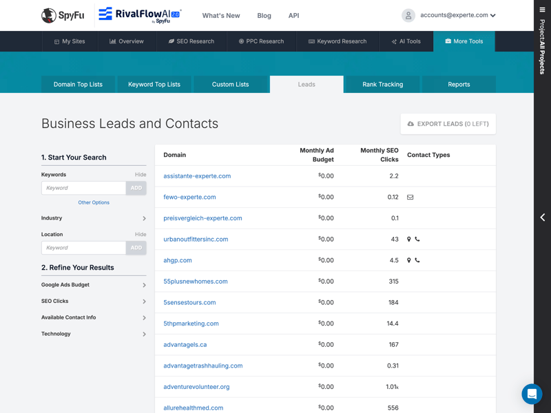 Unusual for an SEO tool: the leads section lets you filter potential business contacts for your sales efforts.