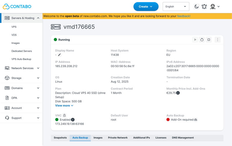 Contabo offers one of the lowest entry barriers in the VPS market. For just a few euros per month, you get plans with generous resources.Modern dashboard