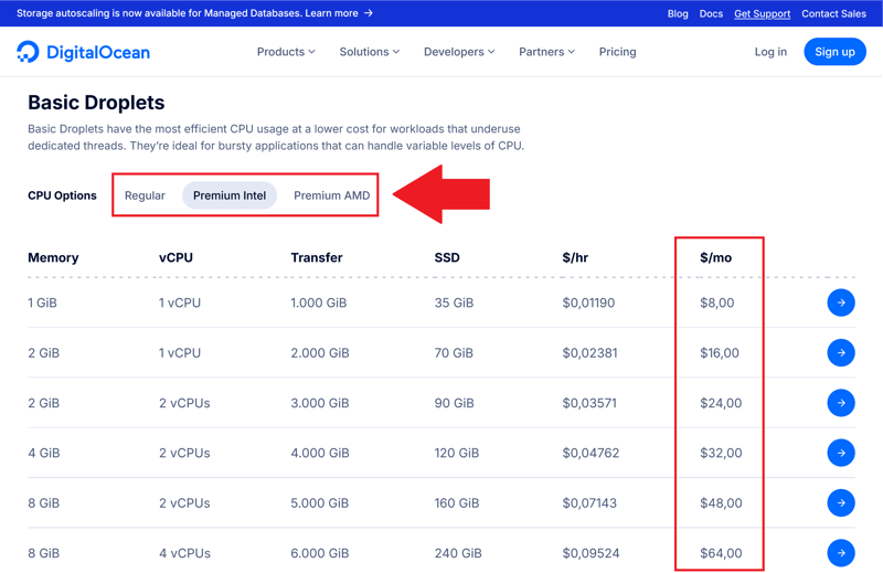 DigitalOcean offers a wide range of VPS plans that vary significantly in performance and resource allocation. Depending on your use case, you can choose between instance types with shared or dedicated CPUs. Options range from small entry-level solutions to powerful enterprise variants: