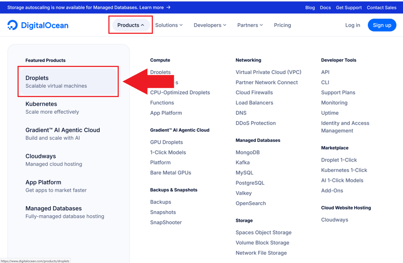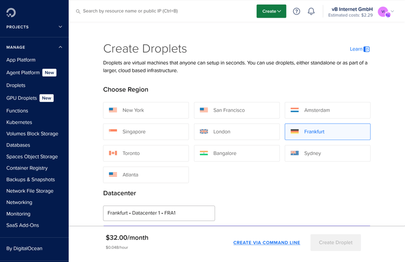 VPS servers are called Droplets at DigitalOcean. The provider describes them as scalable virtual machines that you provision either through the DigitalOcean website or directly from the dashboard.