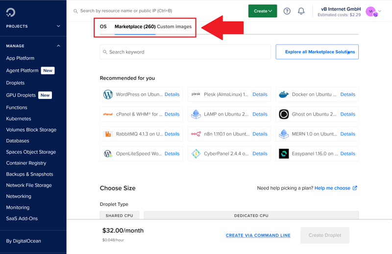 Compared to many competitors, DigitalOcean offers significantly more options during setup. The plans are divided into six main categories that are defined more by their intended use than by overall performance (e.g., CPU or RAM-intensive applications). That's why you should know exactly what you want to use your server for before you start.